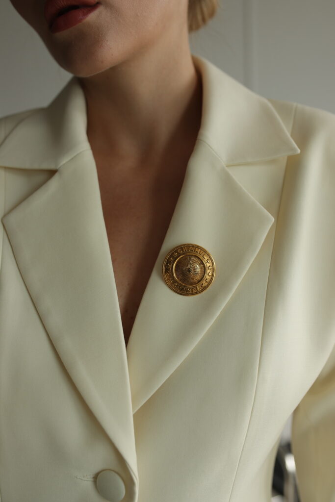 Pin Christian Dior – złota rozetka z kryształem